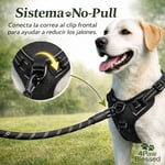 Este arnés ayuda a reducir los tirones gracias a su sistema No-Pull con anillo frontal, distribuyendo la presión de forma uniforme para mayor comodidad y bienestar de tu mascota.