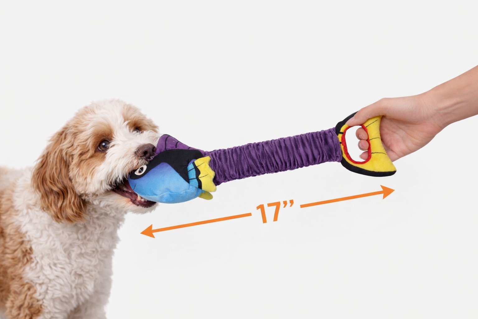 Cuenta con un cuerpo suave tipo peluche, una zona central elástica que añade movimiento al juego, y colores vibrantes que captan la atención de tu mascota. Su diseño es ideal para juegos de sacudir, morder y cargar, ayudando a liberar energía y reducir el aburrimiento.